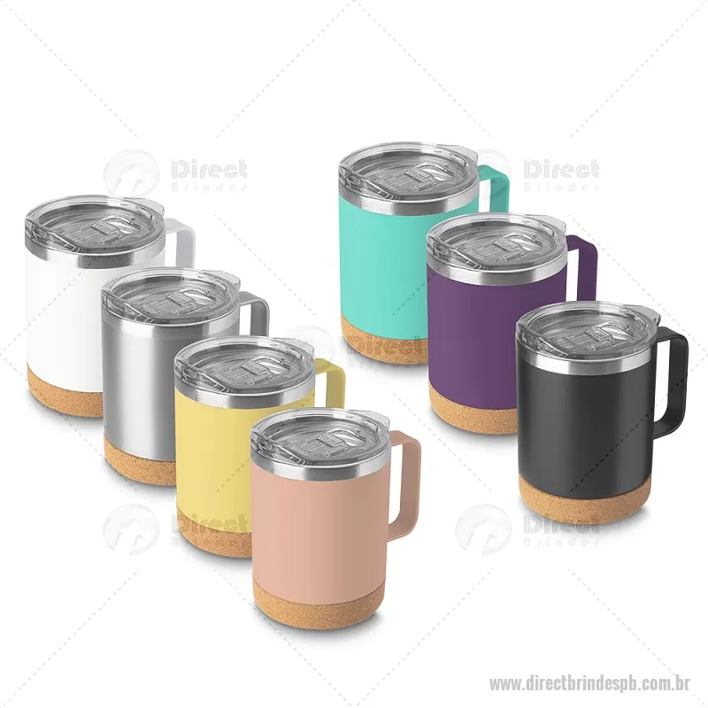 Caneca térmica em aço inox com parede dupla isolada à vácuo, tampa plástica e anel em silicone para vedação, alça lateral em inox na cor do produto, base em cortiça. Capacidade 350ml. - - DRTPBCAN076
